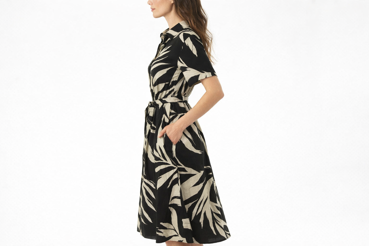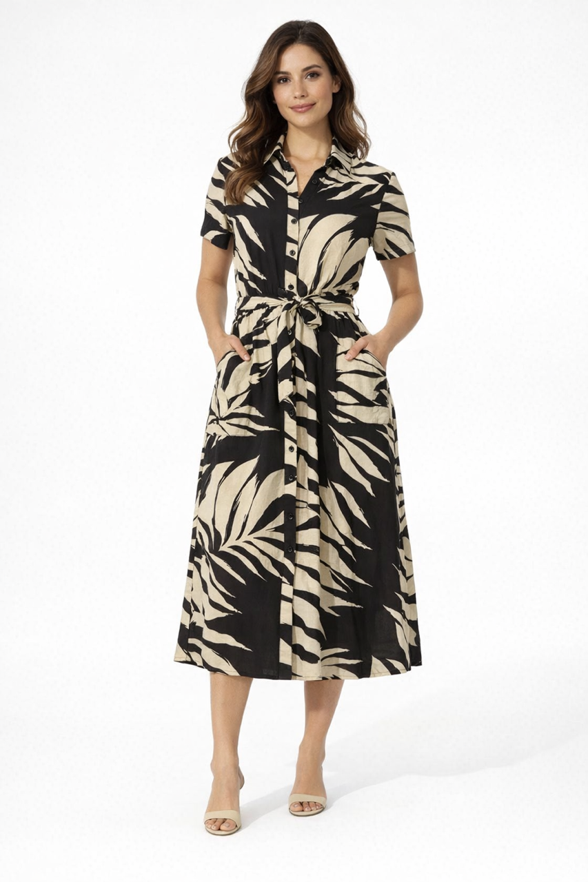 Vestido camisero largo con bolsillos y cinturón del mismo tejido. Fondo negro con estampado en color beige.