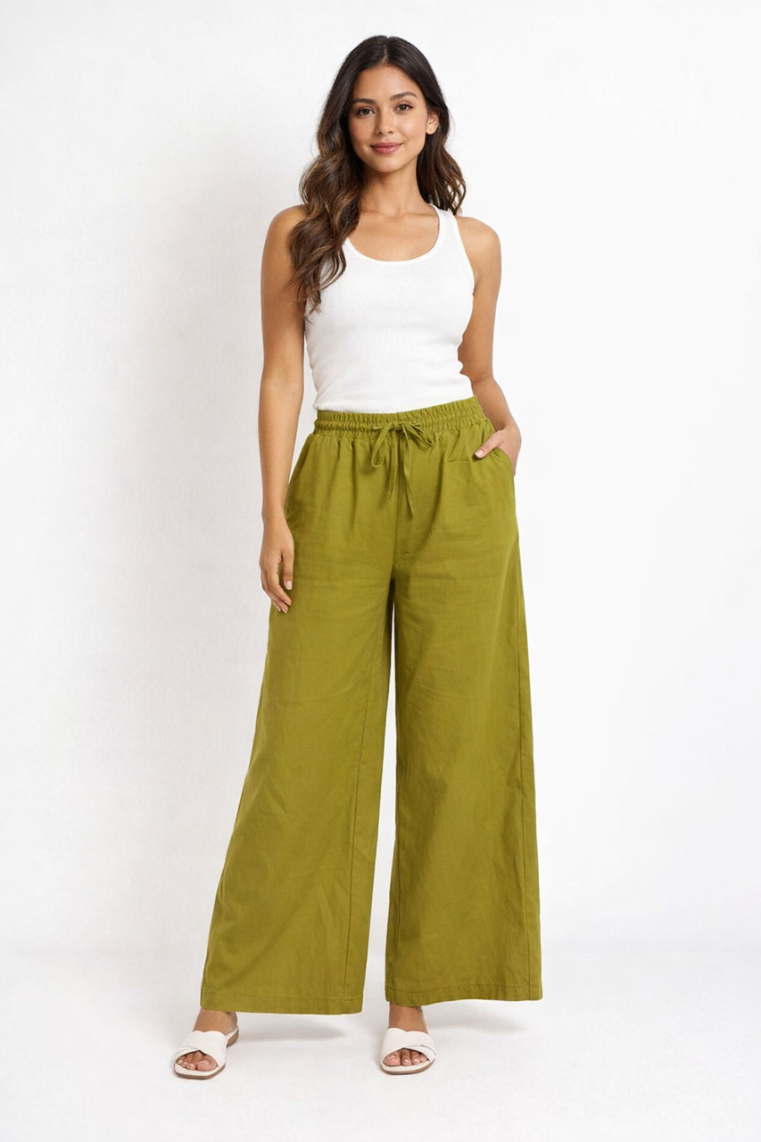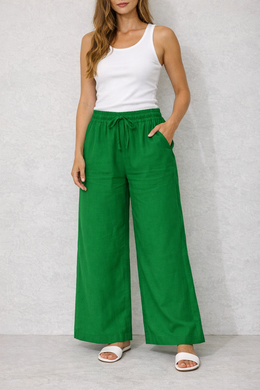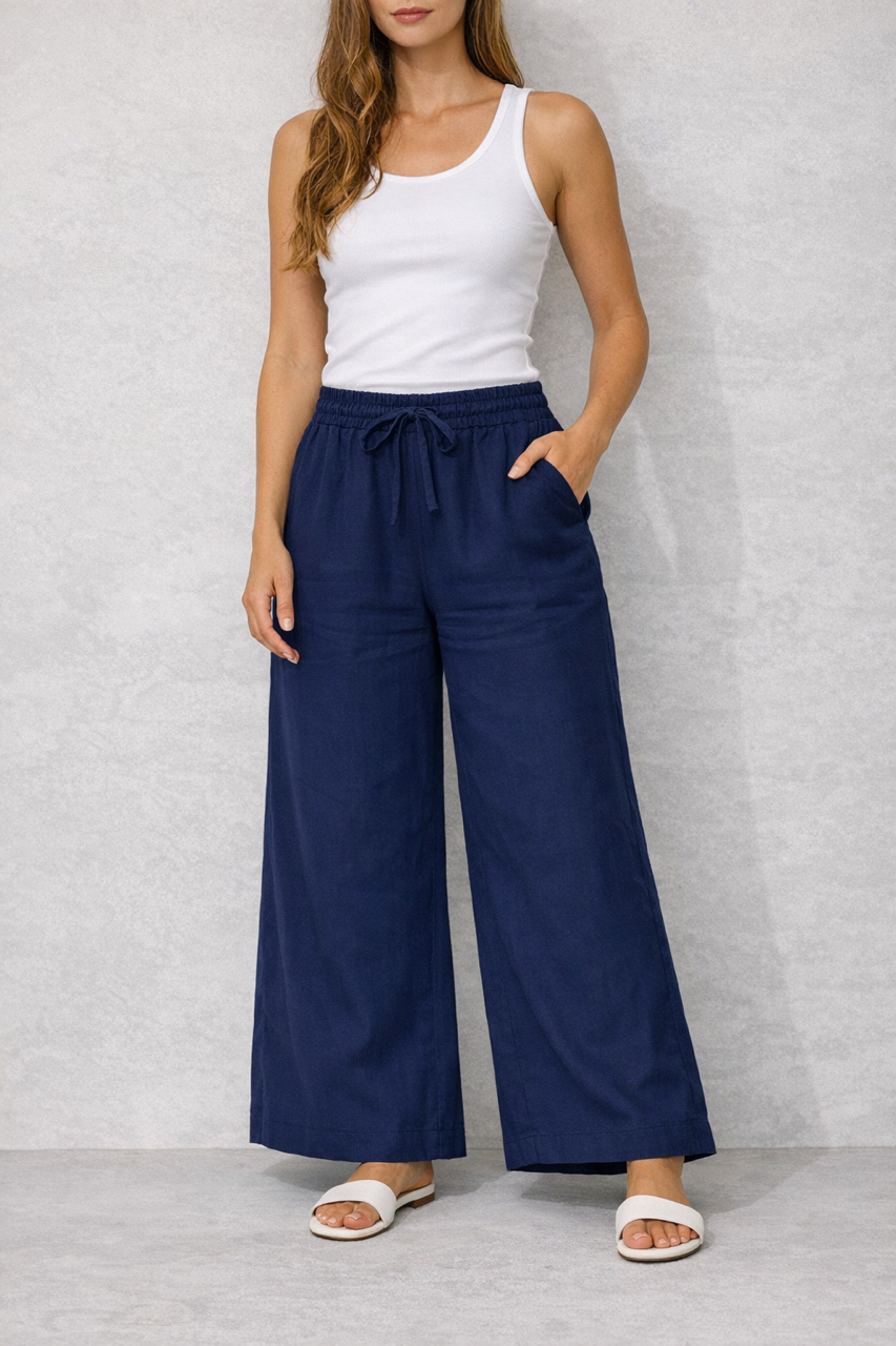 Pantalón básico de pierna ancha con goma en cintura y bolsillos.