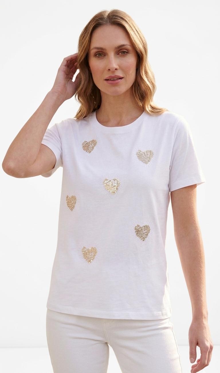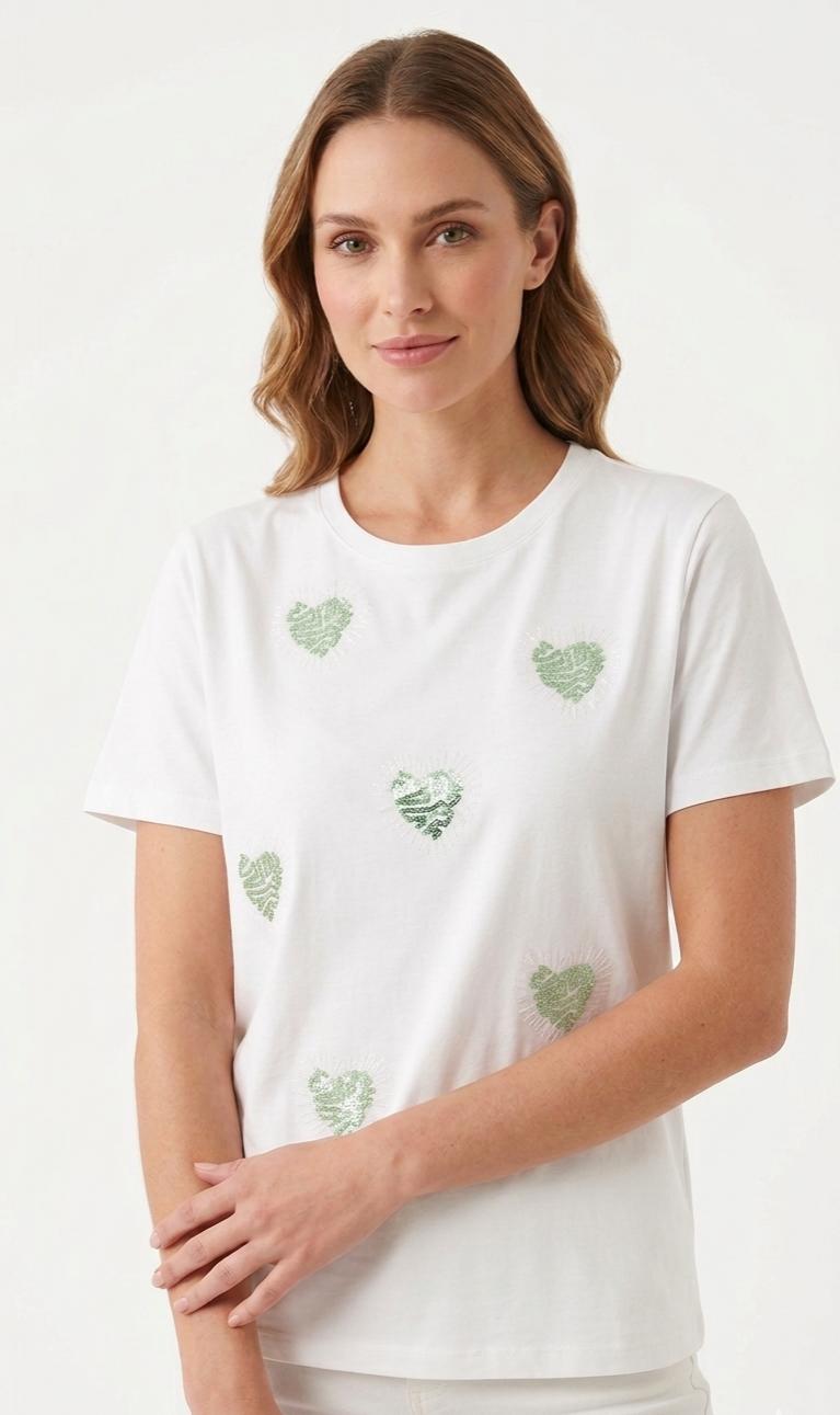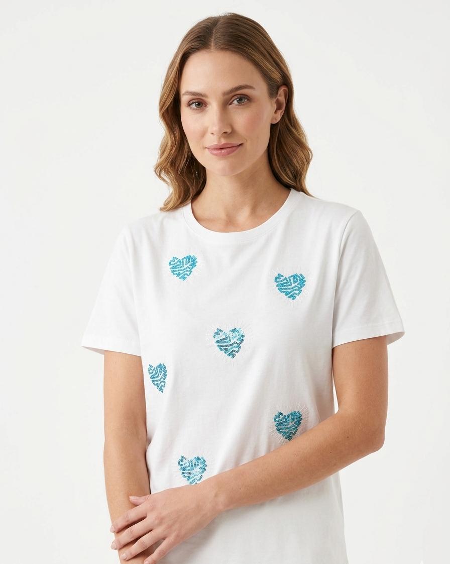 Camiseta básica con corazones de lentejuela y pequeño bordado en blanco.
