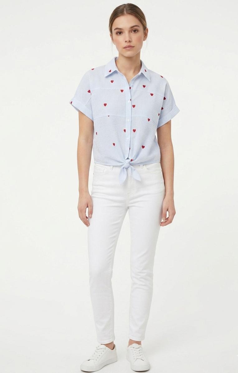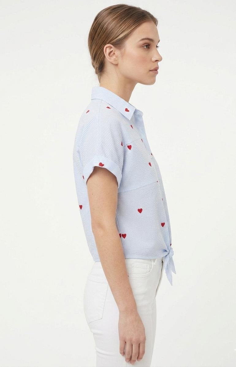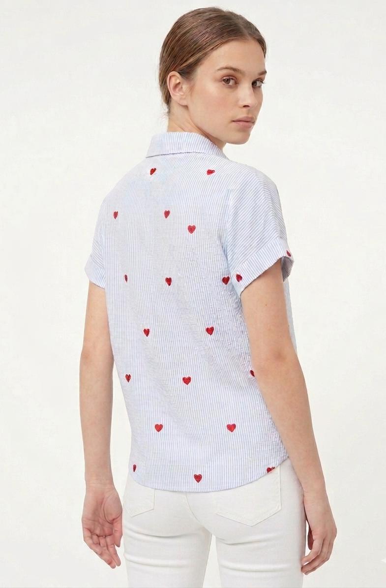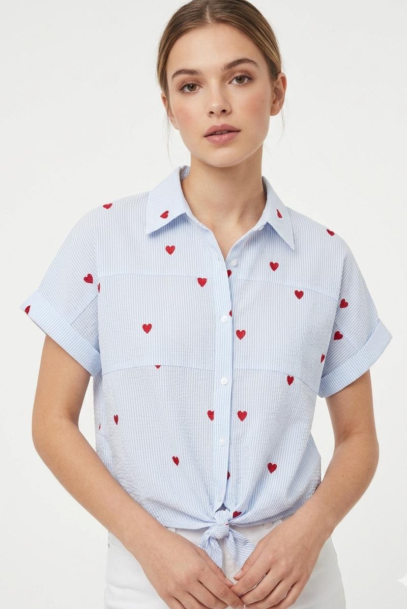 Camisa de manga corta con dobladillo vuelto cosido y cuello camisero. Estampado de rayas verticales en color azul claro y blanco con corazones bordados en color rojo. La parte delantera termina en dos picos largos diseñados para atarse con un nudo a la altura de la cintura.